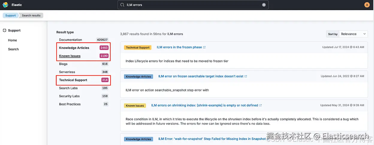 我们将搜索 “ILM errors”,以查看存在哪些类型的文章讨论与索引生命周期管理相关的错误。搜索框返回来自支持中心所有可搜索来源的结果列表,包括文档、博客,而不仅仅是知识文章。在这里你可以看到文档链接首先出现在结果中(多个 Elasticsearch 版本的文档链接):