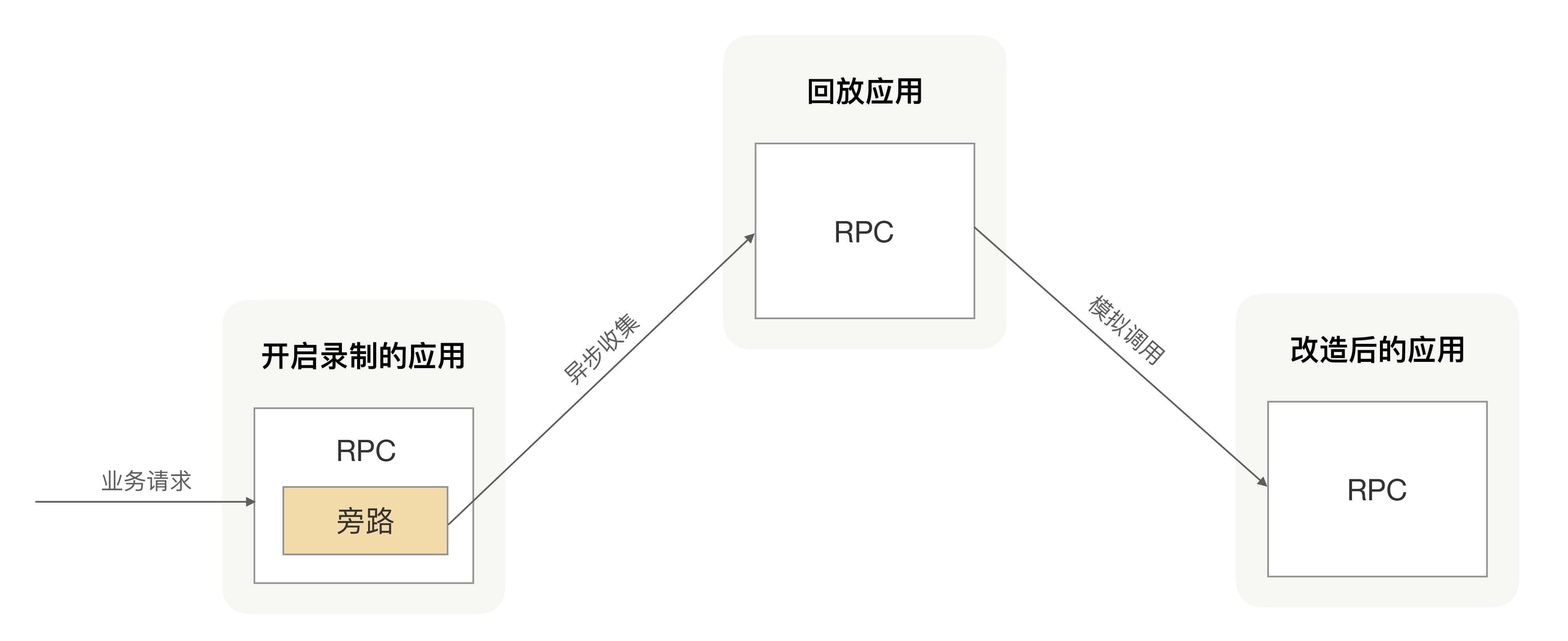 RPC是用来完成应用间通信,即应用间所有请求响应都会经RPC,那在RPC里是否就能很方便地拿到每次请求的出入参数?拿到这些出入参数后,把它们旁录下来,用异步方式发到一个固定地方保存,就完成流量回放里面的录制功能。