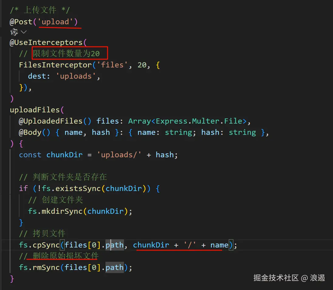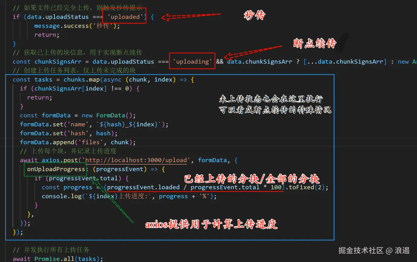 如果是秒传 , 直接告诉用户成功 ; 未上传状态和部分上传状态 , 会进入下面的代码 , 请求后端:http://localhost:3000/upload 接口 , 在后端创建文件夹 , 并且保存分块