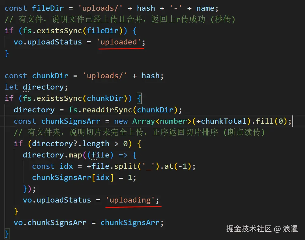 通过检查 uploads 目录下 , 是否有完整文件或文档块来决定返回'uploaded'(秒传)还是'uploading'(断点续传)