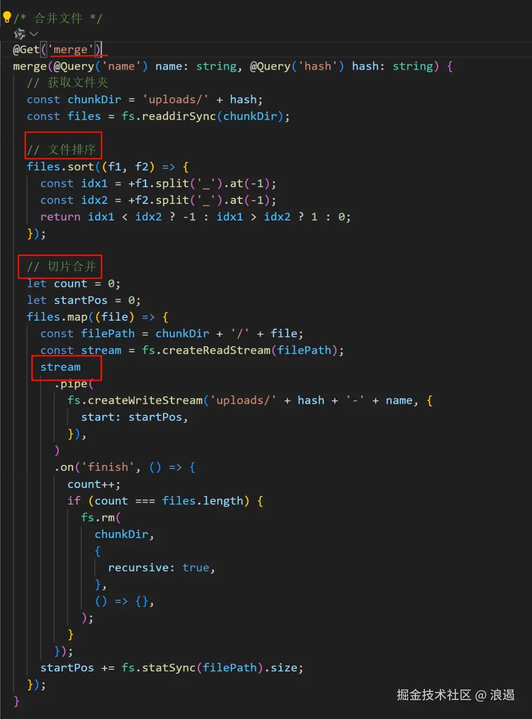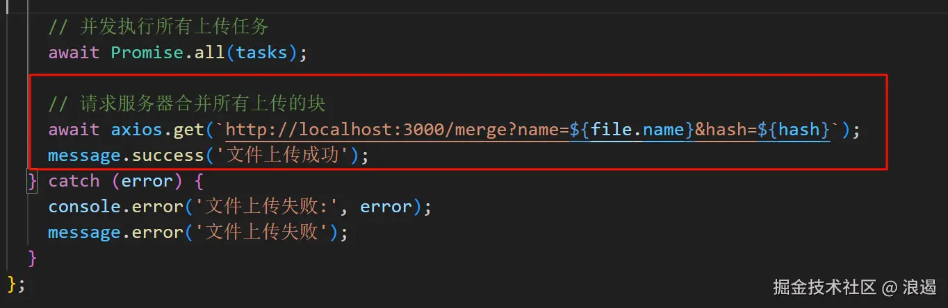 最后继续执行前端下面的逻辑 , 请求后端将分块合并