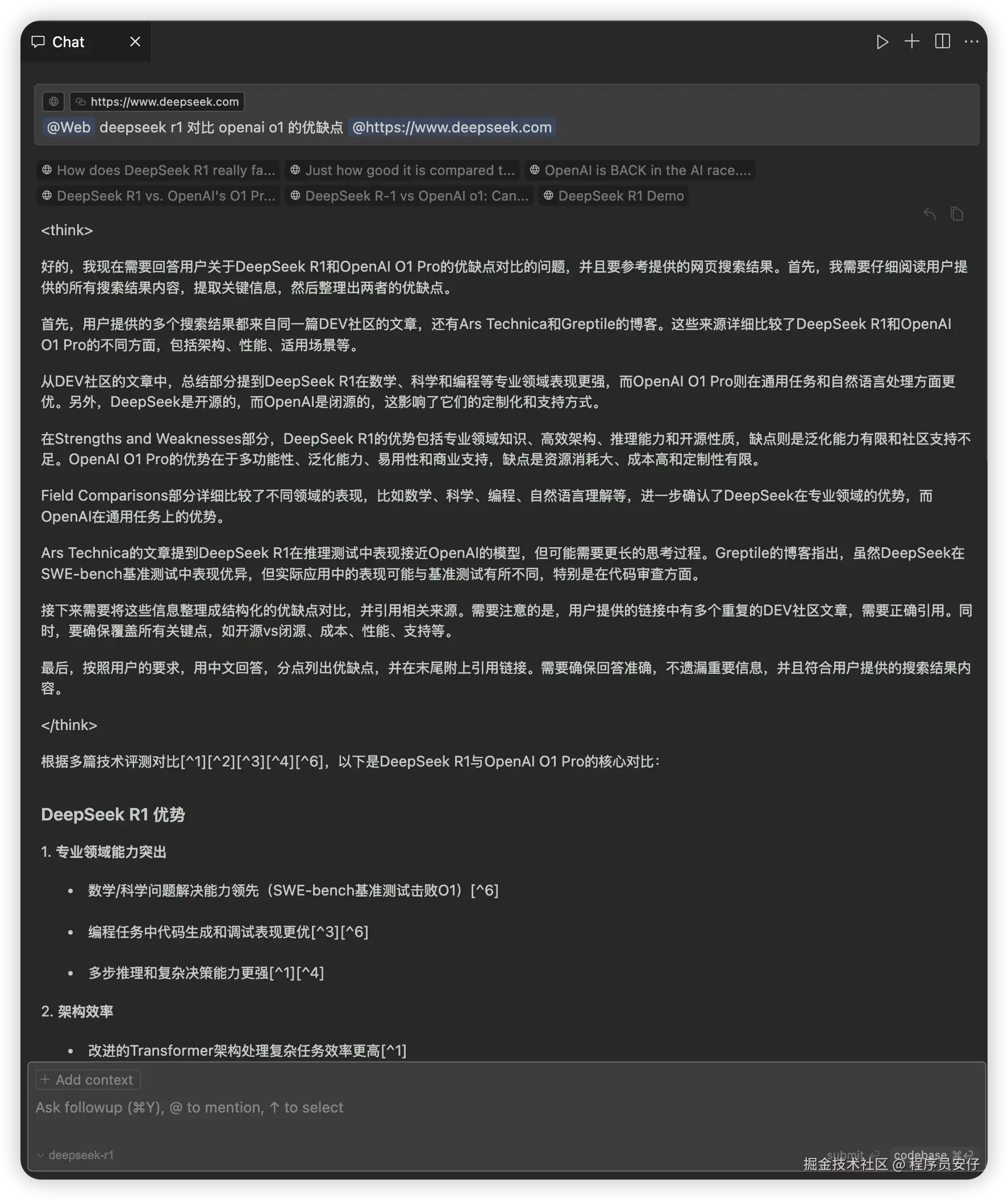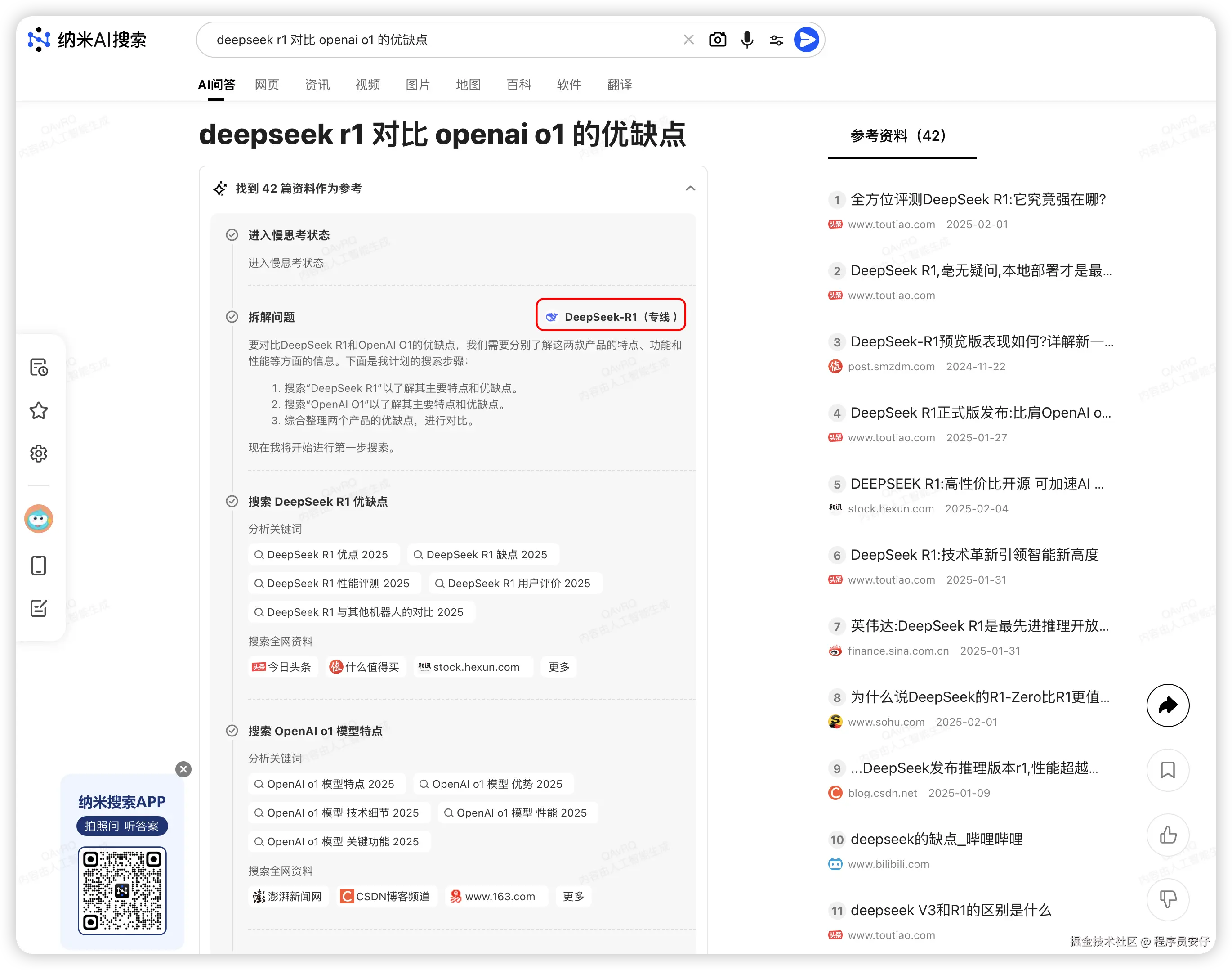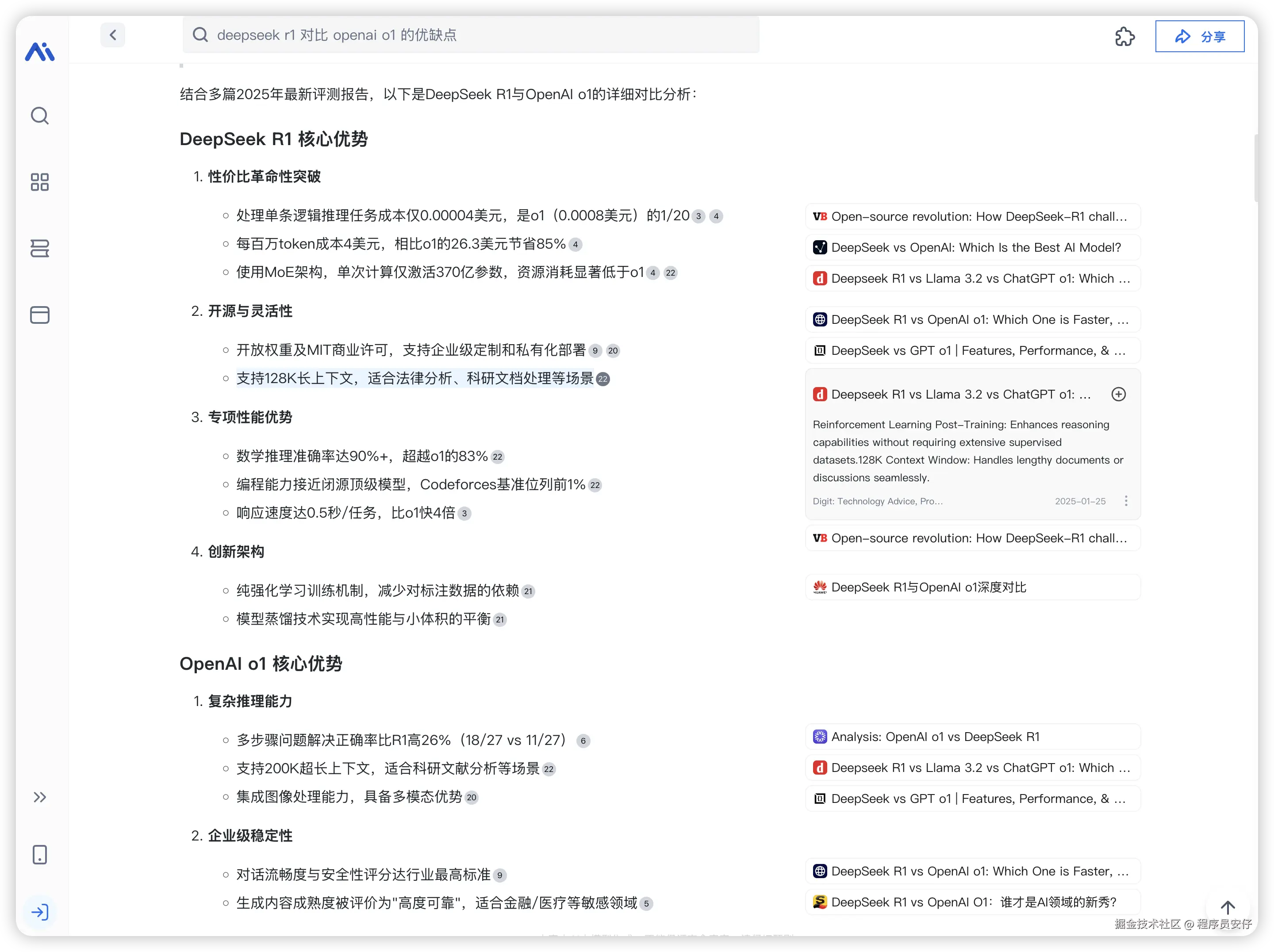 比如我搜索“deepseek r1 和 openai o3 mini 的对比和优缺点”,它就会基于搜索结果来回答你的问题: