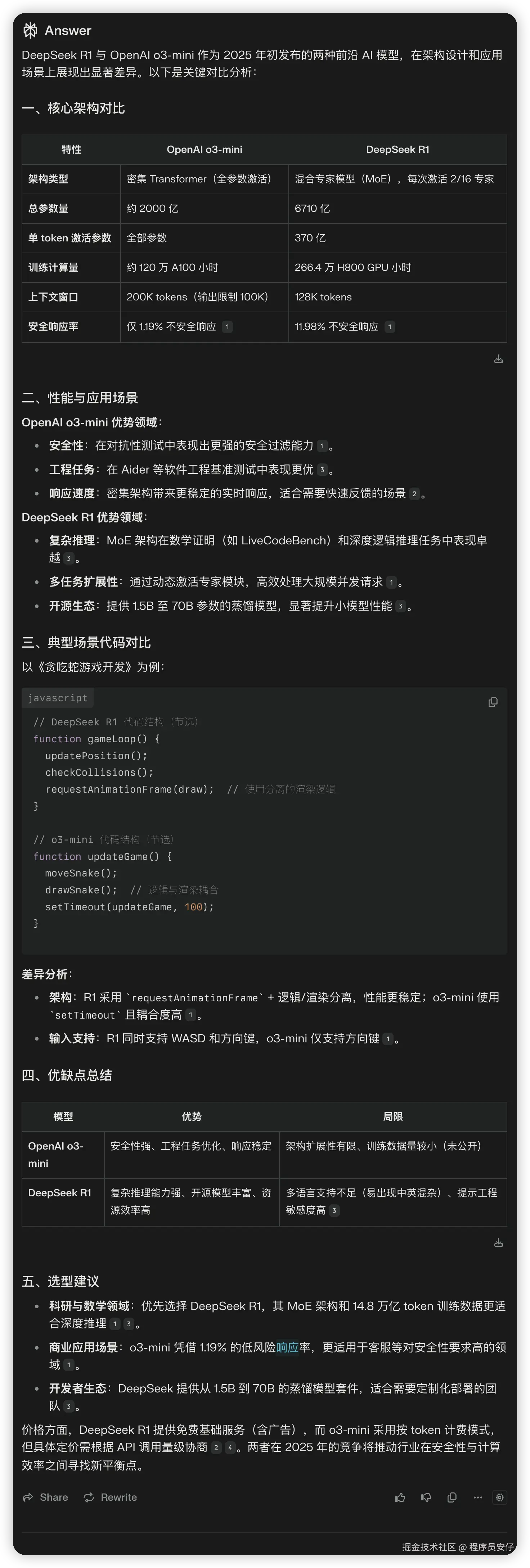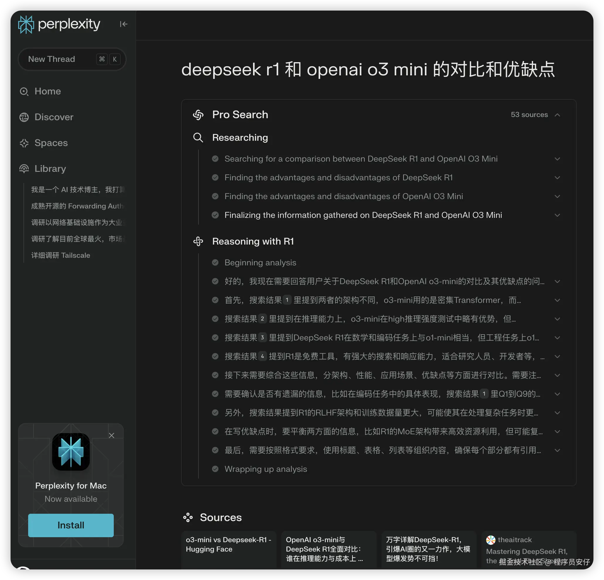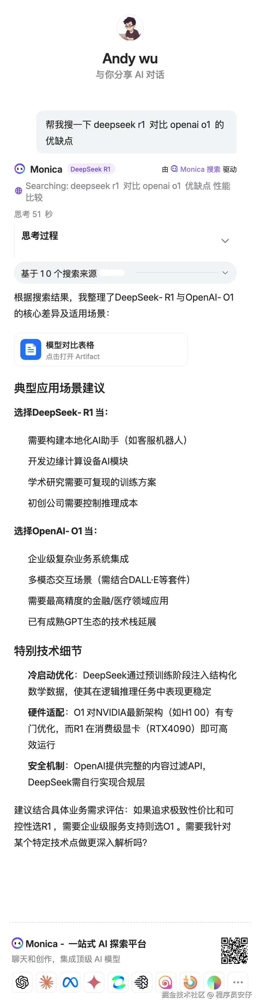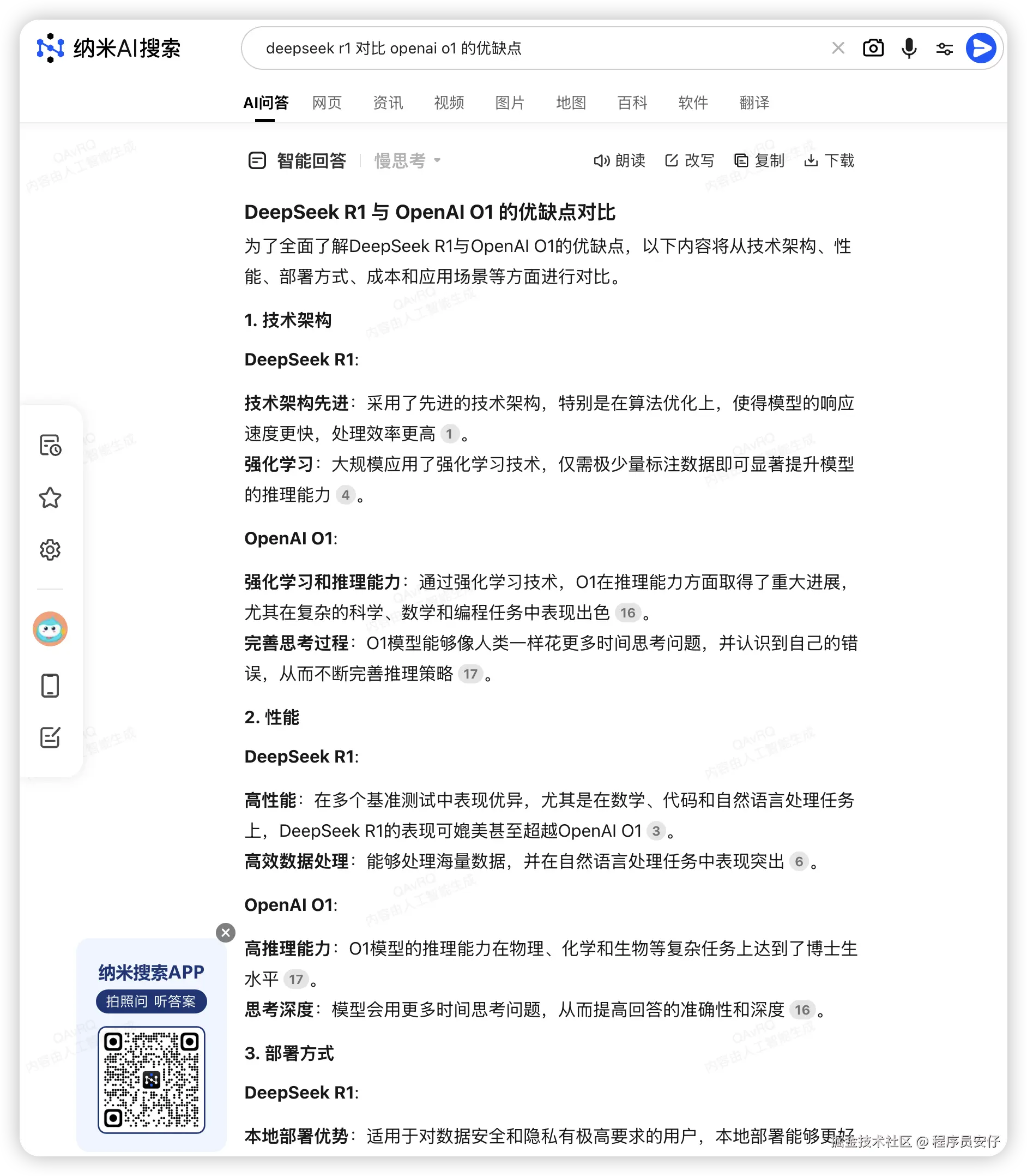 比如我搜索“deepseek r1 和 openai o3 mini 的对比和优缺点”,它就会基于搜索结果来回答你的问题: