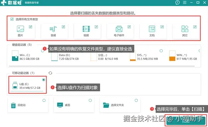 第1步: 打开这款软件,将U盘连接到电脑后,然后选择文件类型和扫描位置,点击【扫描】;