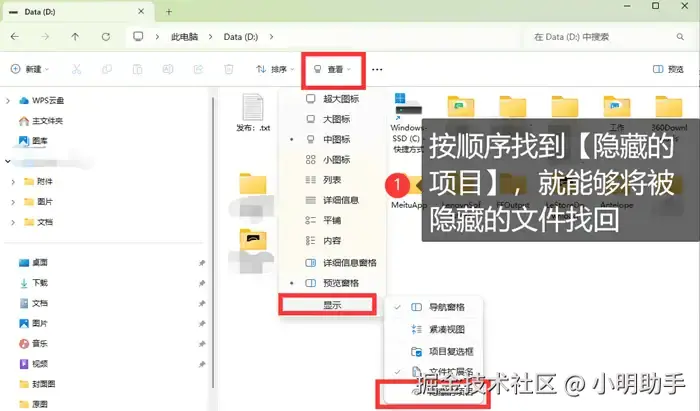 在病毒被消除后,文件也需要用户通过一系列步骤才能够找回,实现U盘数据恢复:打开【此电脑】里面的U盘,然后点击上方的【查看】后滑到列表的最下面点击【显示】,看见【隐藏的项目】后点击,就能让隐藏文件显示回来。