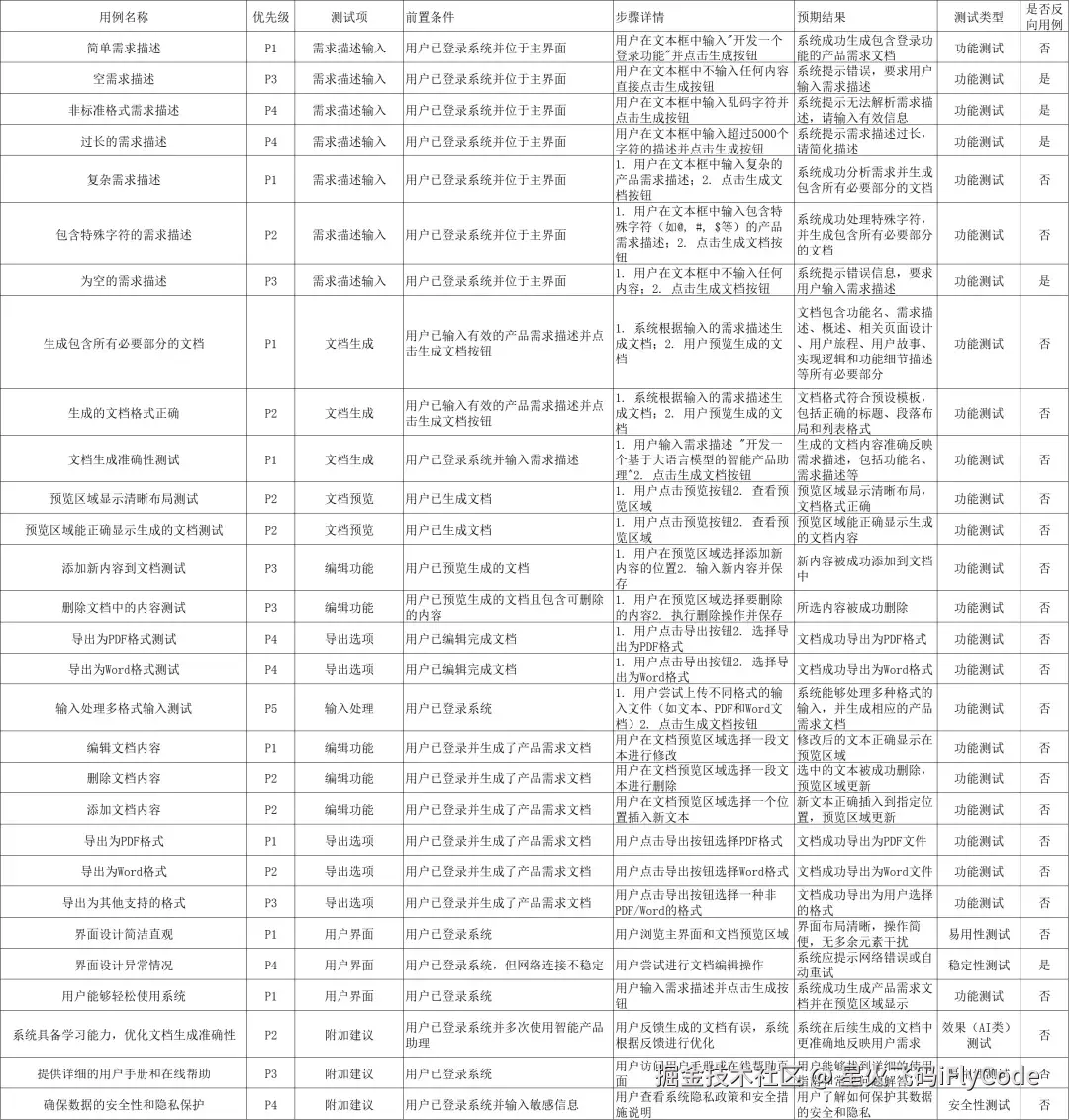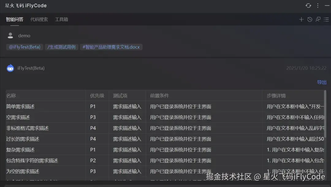 iFlyTest助理能够充分理解需求,针对需求中描述模块,如权限、登录、用户管理及文件的管理等功能均给出了用例,且标识了用例的优先级、前置条件及预期结果等属性, 最后可以导出用例。