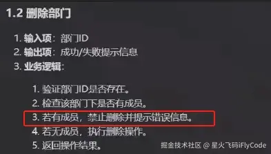 在业务逻辑部分,也非常细心的给出一些经常忽略的分析点,如当成员或者部门有信息时应无法删除、删除失败的异常提醒等。