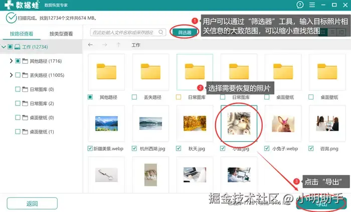 步骤2: 软件一键深度扫描结束后,在指定位置上选择需要恢复的照片,然后点击“导出”;