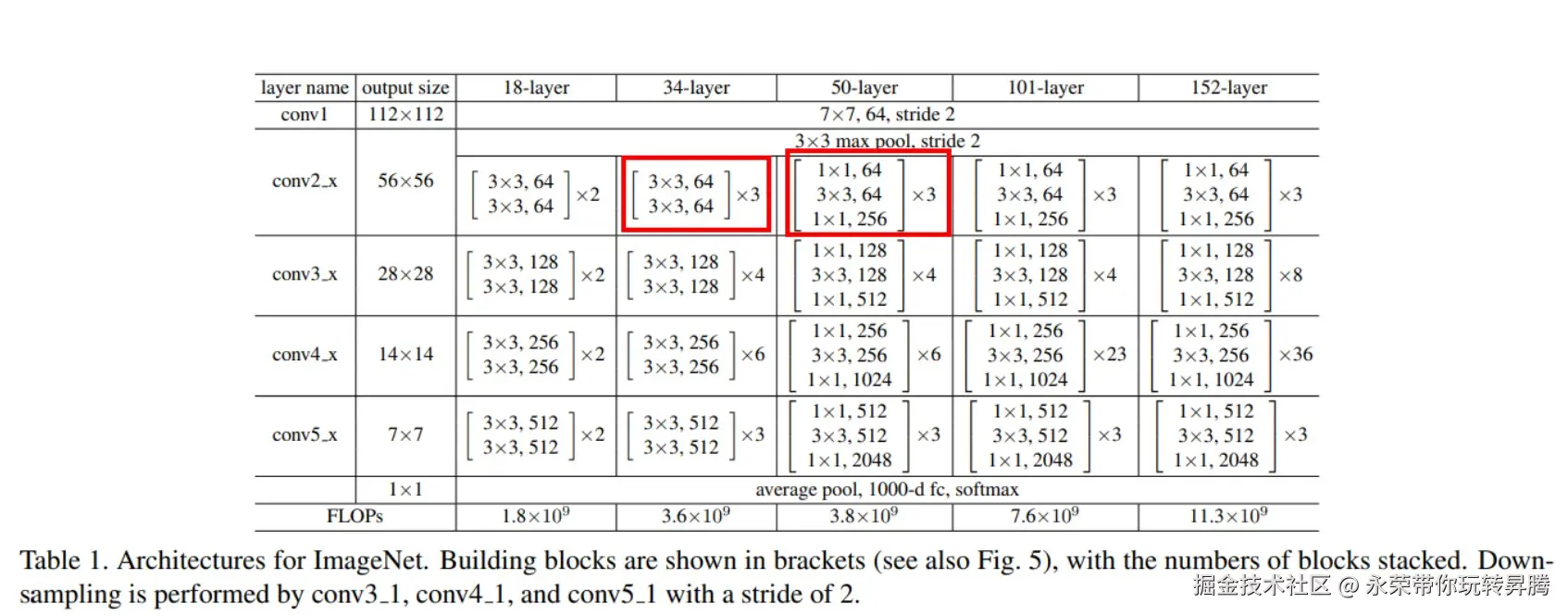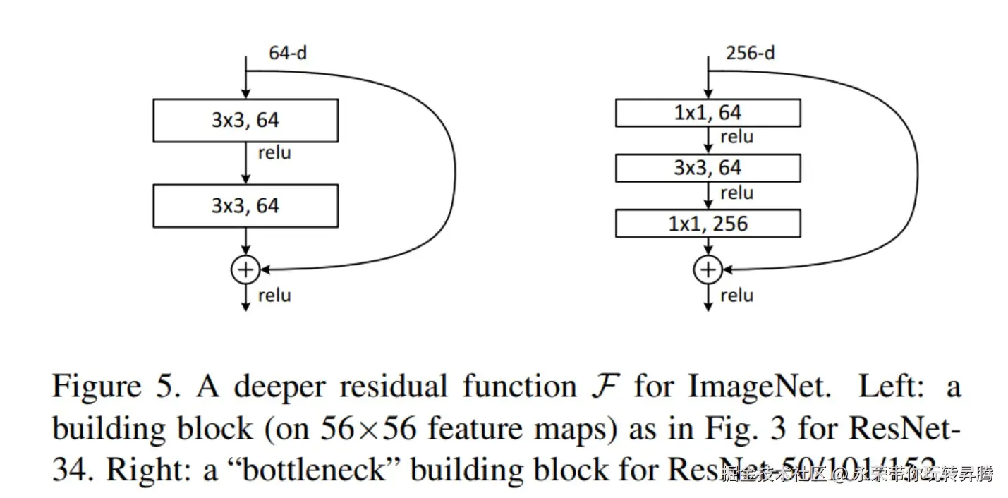 ResNet的思想和Highway Network的思想也非常类似,允许原始输入信息直接传到后面的层中,如下图所示,resnet网络主要用到了残差模块,主要分为两种结构,以50层作为一个区分边界,结构在原论文中定义如下: