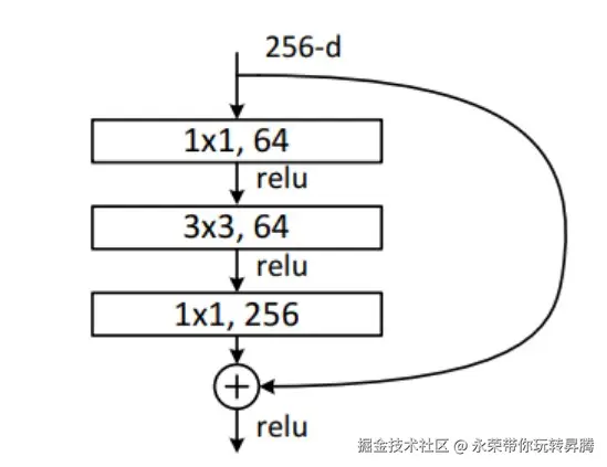 Bottleneck模块介绍: 该基础模块主要用于50层数以上的resnet网络之中,其架构如下图所示: