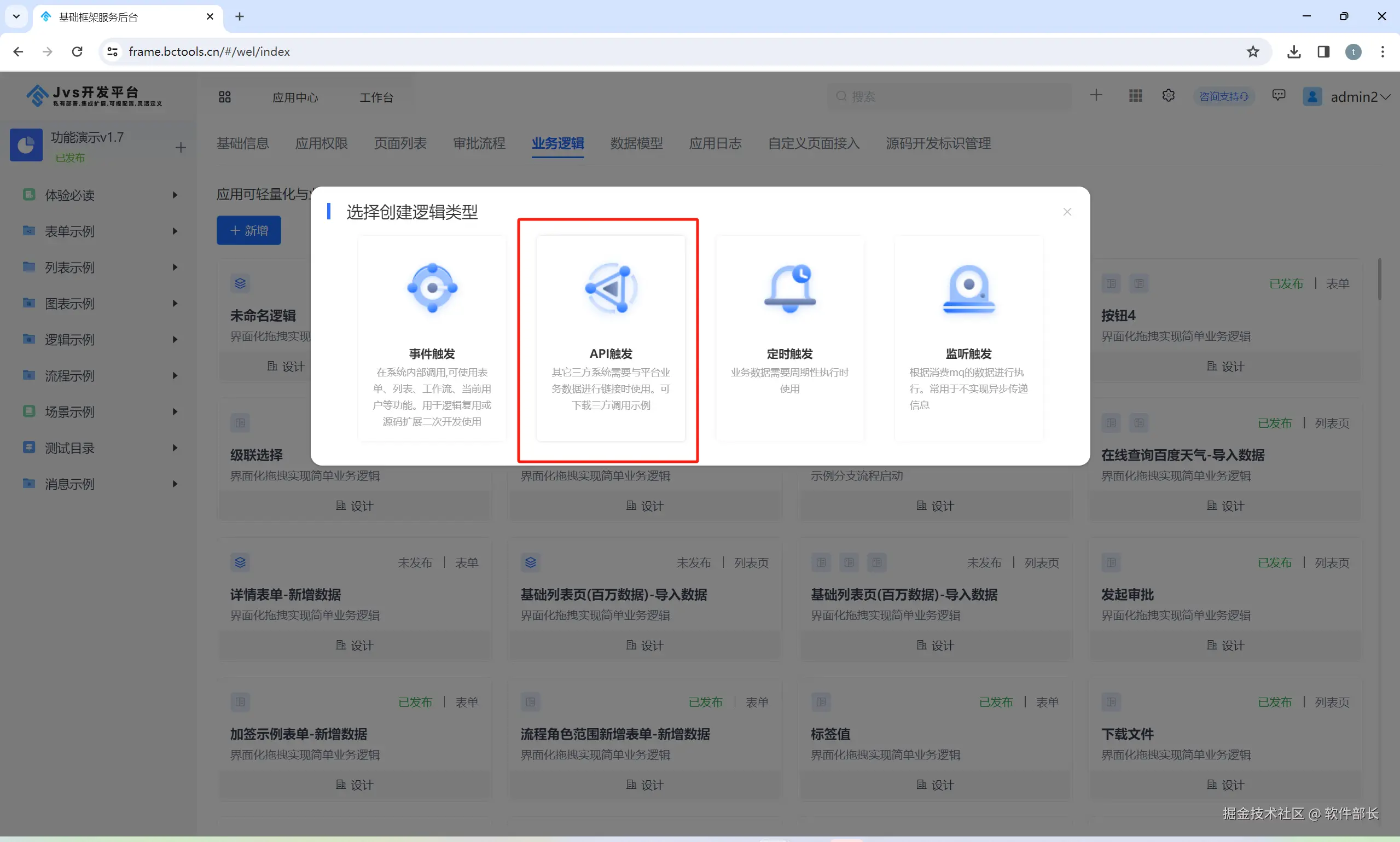 逻辑引擎设计的逻辑体支持多种触发执行的方式,确保能够灵活适应不同的业务场景需求。这些触发方式包括但不限于事件驱动(界面上的点击操作或者业务事件)、定时调度(定时的任务触发)、API调用(三方的系统http调用)、响应消息触发等,每种方式都旨在高效、准确地启动逻辑执行流程。