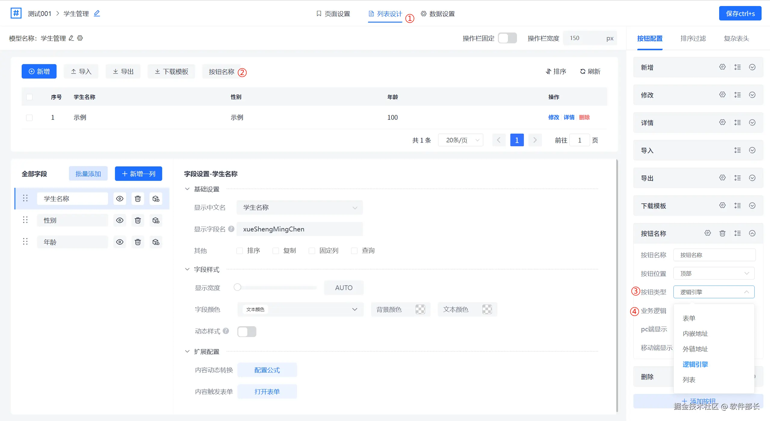 列表页的按钮是可以触发逻辑的,选择逻辑后,点击设计进入列表页设计器,找到按钮的相关设置,选择按钮触发的类型“逻辑”,那么实现的结果相当于用户点击这个按钮,就触发对应的逻辑执行。这种场景逻辑设计常常用于对列表页的数据处理,比如批量处理、或者对模型的操作(可以对整个模型,或者模型中的某一条数据)。