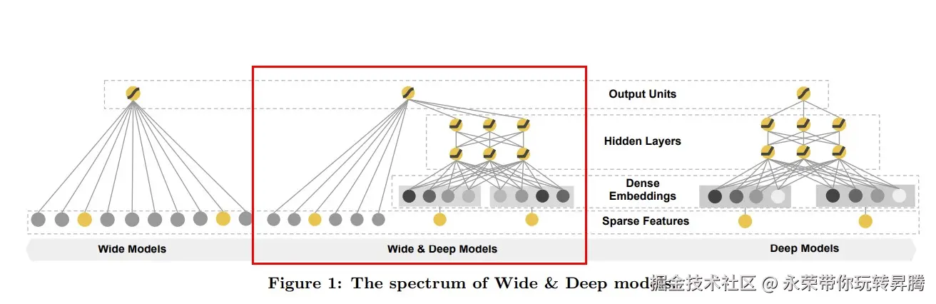 WideDeep网络中的Deep部分则是一个前馈神经网络(下图右侧部分,已框出来),其输入是一个sparse的feature,该输入通过神经网络第一层后将被转化成一个低维度的embedding向量,网络训练的是这个embedding,主要是用来处理类别特征,比如item的类目、用户的性别等。