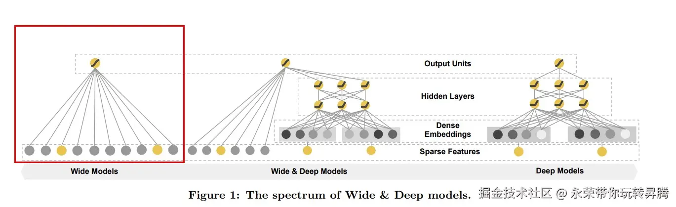 WideDeep网络是由两部分组成,一部分是Wide模块,另一部分是Deep模块。其中Wide部分是一个广义线性模型(下图中左侧部分,已框出来)即y = W^Tx + \hat{b} ,其中,y 是需要预测的结果,x 是一个d维度的特征向量。w 是模型参数,b是偏置。特征集包含原始输入特征和转换特征。