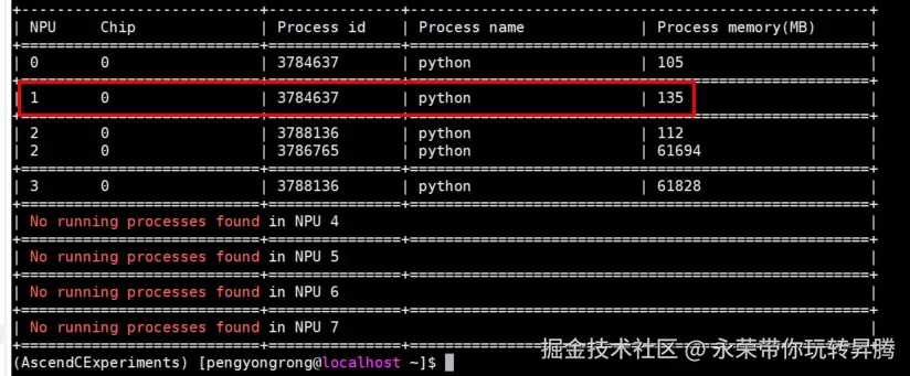 内存使用情况: 整个训练过程的内存使用情况可以通过"npu-smi info"命令在终端查看,因此本文实验只用到了单个npu卡(也就是chip 1),前面指定device=1,内存占用约135M,对内存、精度或性能优化有兴趣的可以自行尝试进行优化,这里运行过程中也有其他程序在运行,因此本实验用到的网络所需要的内存已单独框出来。