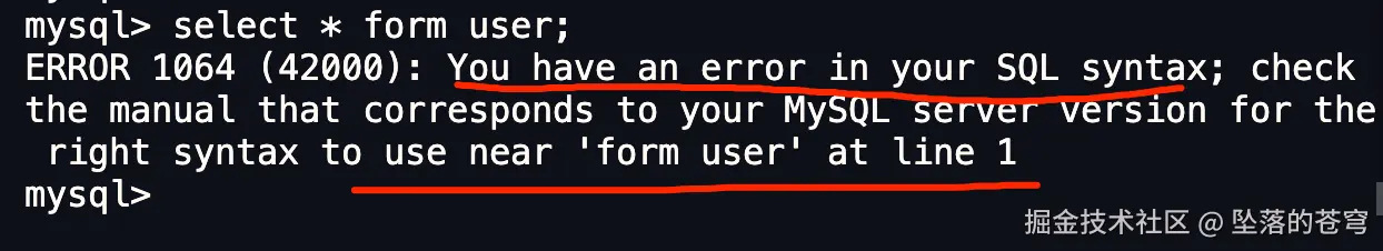 如果我们输入的 SQL 语句语法不对,就会在解析器这个阶段报错。比如,我下面这条查询语句,把 from 写成了 form,这时 MySQL 解析器就会给报错。