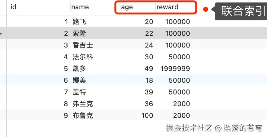 举一个具体的例子,方便大家理解,这里一张用户表如下,我对 age 和 reward 字段建立了联合索引(age,reward):