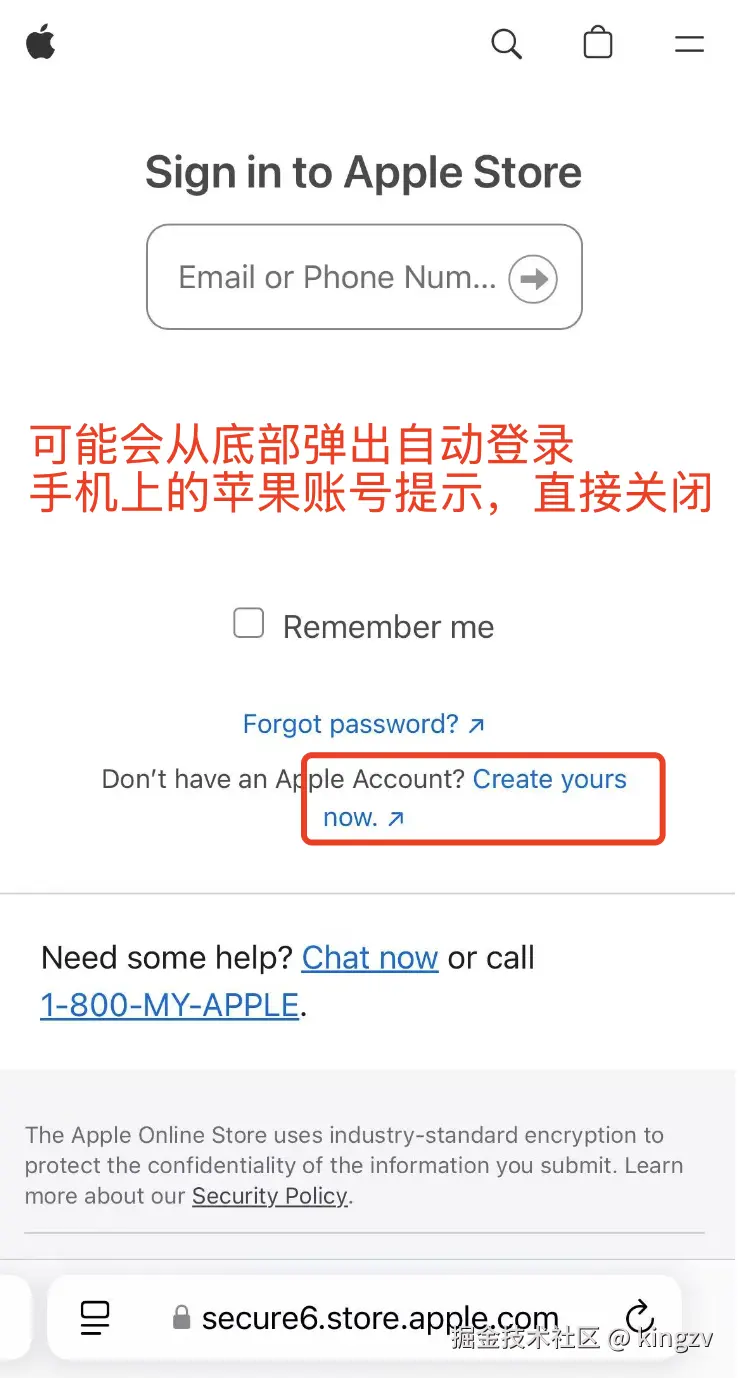 - 确认打开的是美国官网后,按下图顺序依次点击,跳到苹果账号注册页面( account.apple.com/account )。