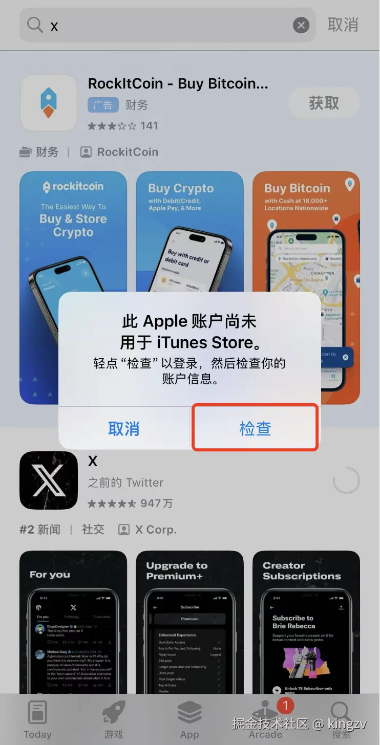 - 接下来随便安装一个APP,这时候会弹出“此Apple账户尚未用于App Store”,点击“检查”按钮。然后同意条款,再点“下一页”,输入账单寄送地址(使用前面生成的地址),点击“完成”。