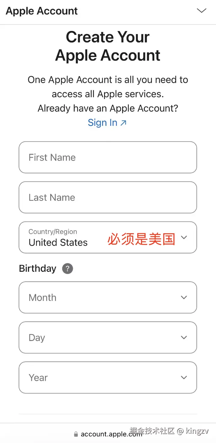 - 现在就到了苹果账号注册页面了( account.apple.com/account ),其实也可以直接打开这个地址,前面的步骤不要,但是很容易跳到国区,只要拉到网页最底下,确认地区为United States也行。接下来填写账号信息,用英文填写,年龄最好设置成大于18岁的,邮箱要没用过的,手机号可以是使用过的,国内的邮箱和手机号就可以。