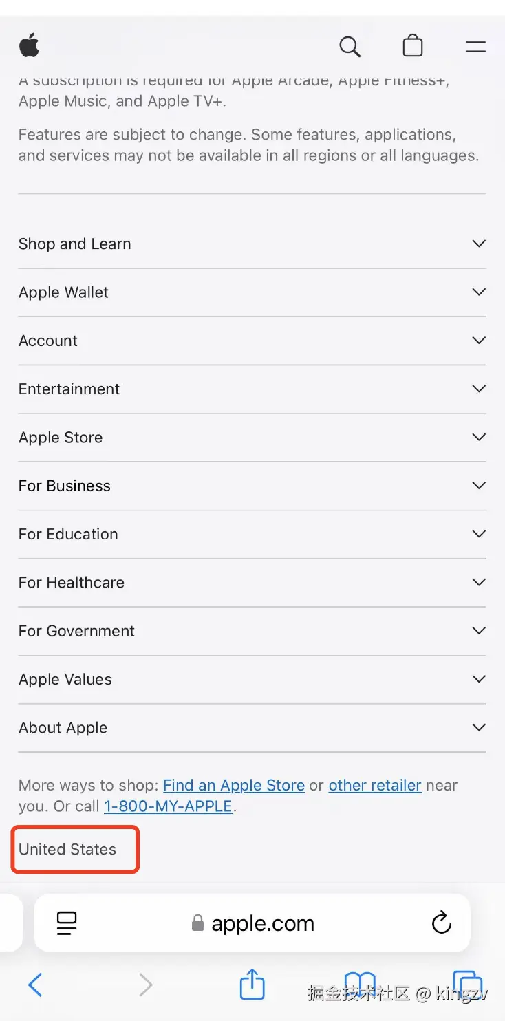 - 用手机Safari浏览器打开苹果官网( www.apple.com ),正常默认打开的是美国官网,不过你最好还是要确认一下:拉到网页最底下,看地区是否为United States。