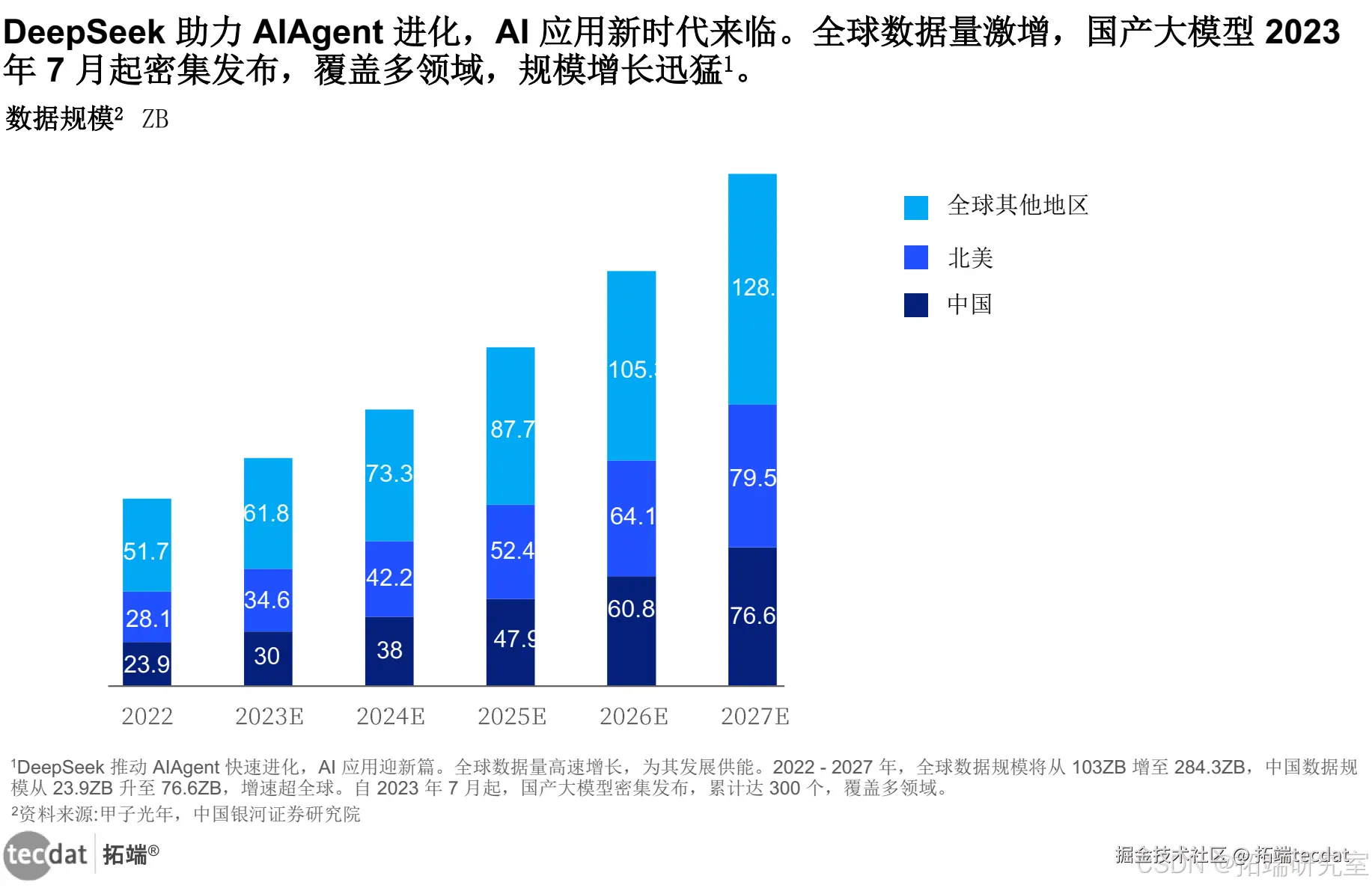 DeepSeek 的推动让 AIAgent 快速进化,引领 AI 应用步入新时代。当下,全球数据量持续高速增长,为 AIAgent 的发展提供了丰富的数据资源。从数据规模来看,2022 年,全球数据规模已达 103ZB,其中中国数据规模为 23.9ZB 。而预测未来五年,全球数据量仍将保持增长趋势,预计到 2027 年,全球数据规模可攀升至 284.3ZB,近五年的复合年均增长率(CAGR)达 22%。中国数据量增长更为迅猛,届时规模可达 76.6ZB,CAGR 为 26%,超过全球增速。