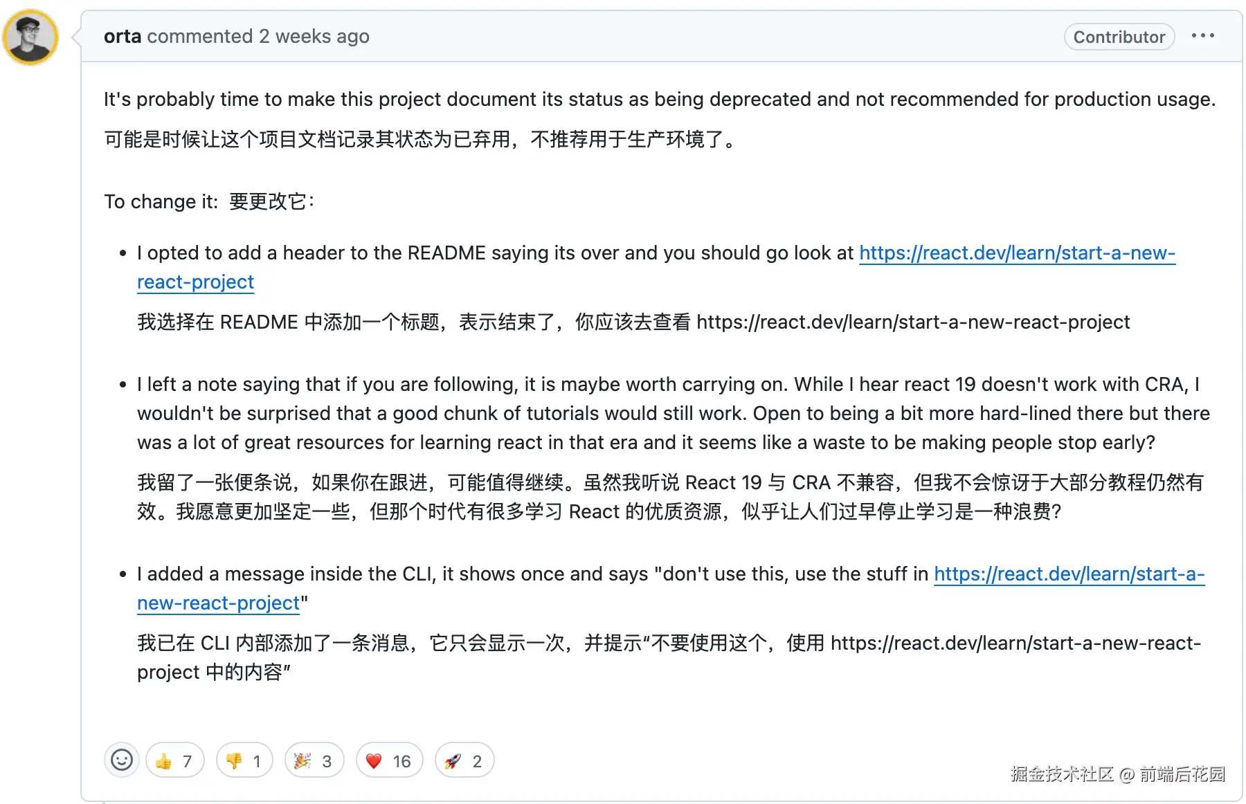 两周前,React 官方将 create-react-app 使用文档标记为废弃了,原因是 React 19 与 CRA 不兼容。