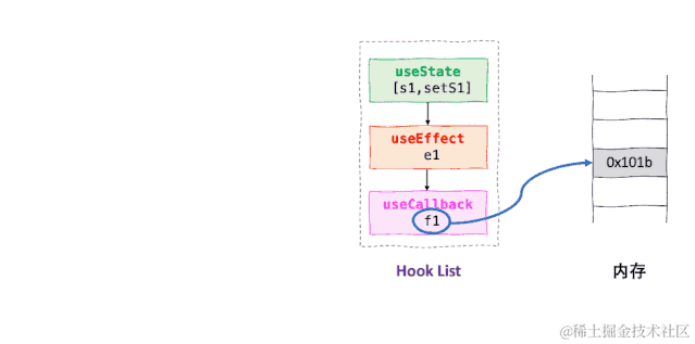 调用 useCallback 也是追加到 Hook 链表上,不过这里着重强调了这个函数 f1 所指向的内存位置,从而明确告诉我们:这个 f1 始终是指向同一个函数。然后返回的 onClick 则是指向 Hook 中存储的 f1。