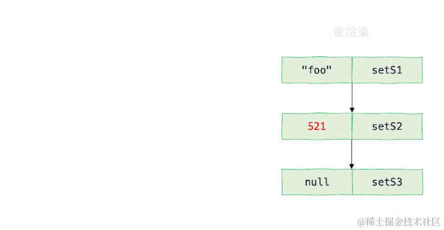 在初次渲染结束之后、重渲染之前,Hook 记录链表依然存在。当我们逐个调用useState 的时候,useState 便返回了 Hook 链表中存储的状态,以及修改状态的 Setter。