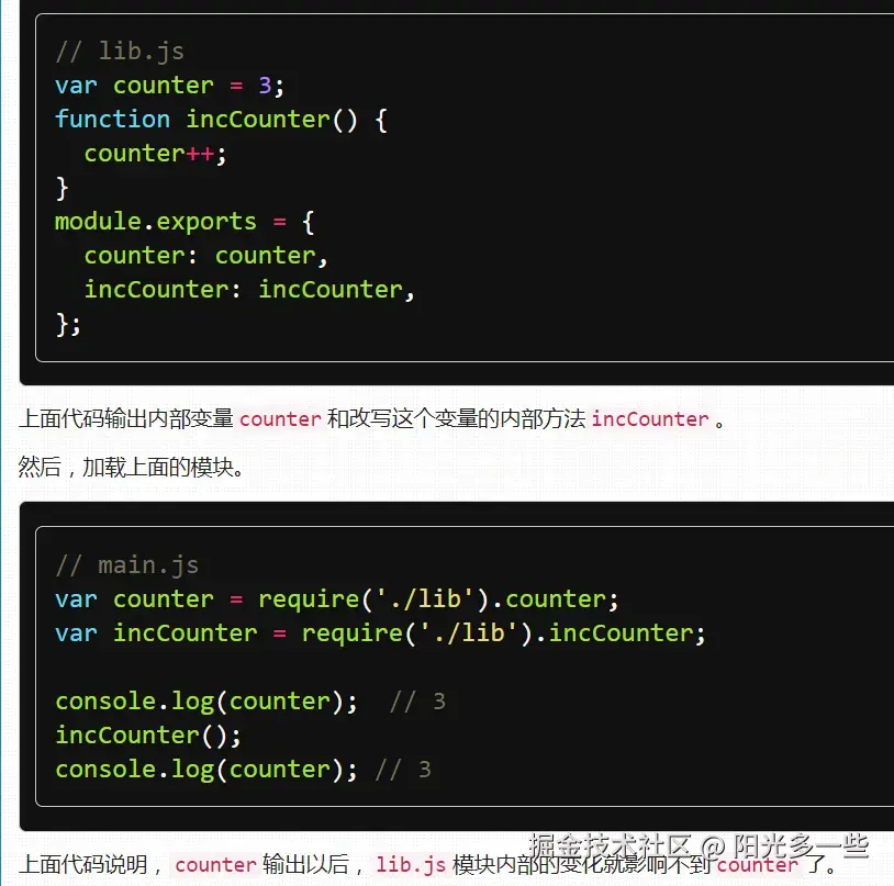 commonsJS的加载机制,输入的是被输出值的拷贝。也就是说,一旦输出一个值,模块内部的变化就影响不到这个值了。