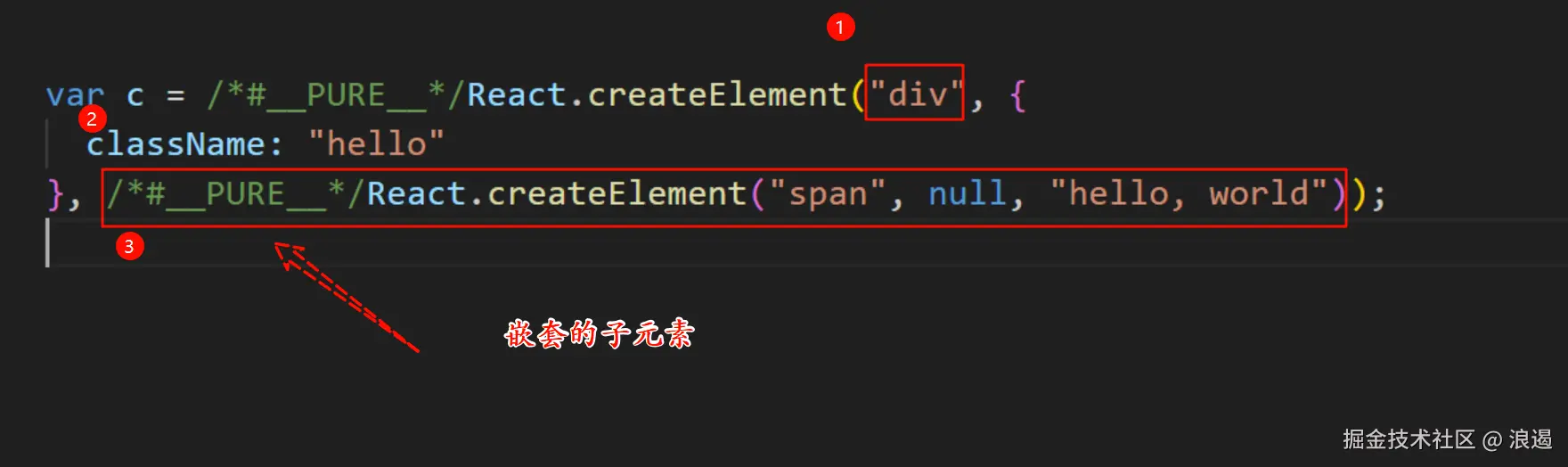 总结为这样的形式 React.createElement(tag,props,...child) , child 指的是嵌套的子元素 , 比如上面代码