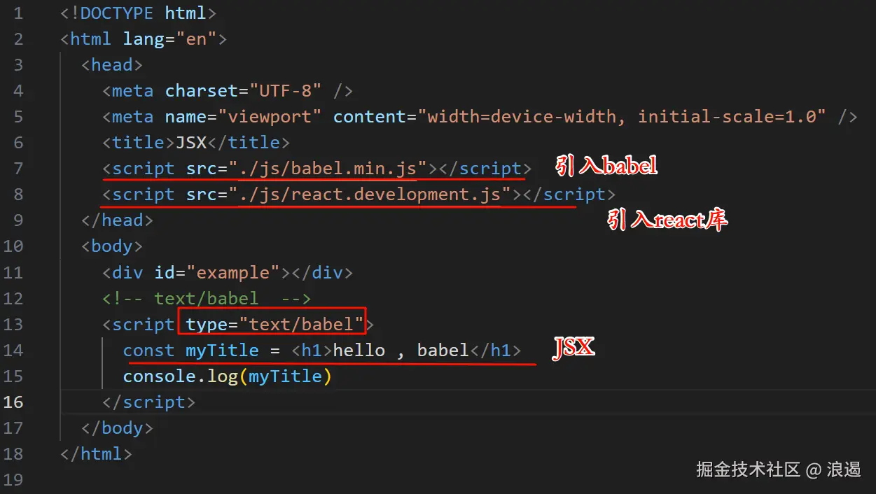我们再来看看 React 中使用 JSX , 我们也会引入 Babel , 我引入当目录下的 babel 和 React 核心库