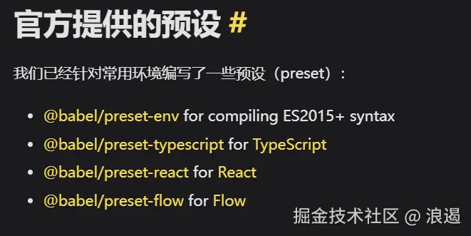 更多的预设规则可以参考官网 : www.babeljs.cn/docs/preset…