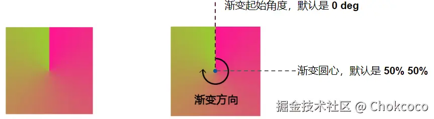 - 默认渐变角度 0deg 是从上方垂直于圆心的