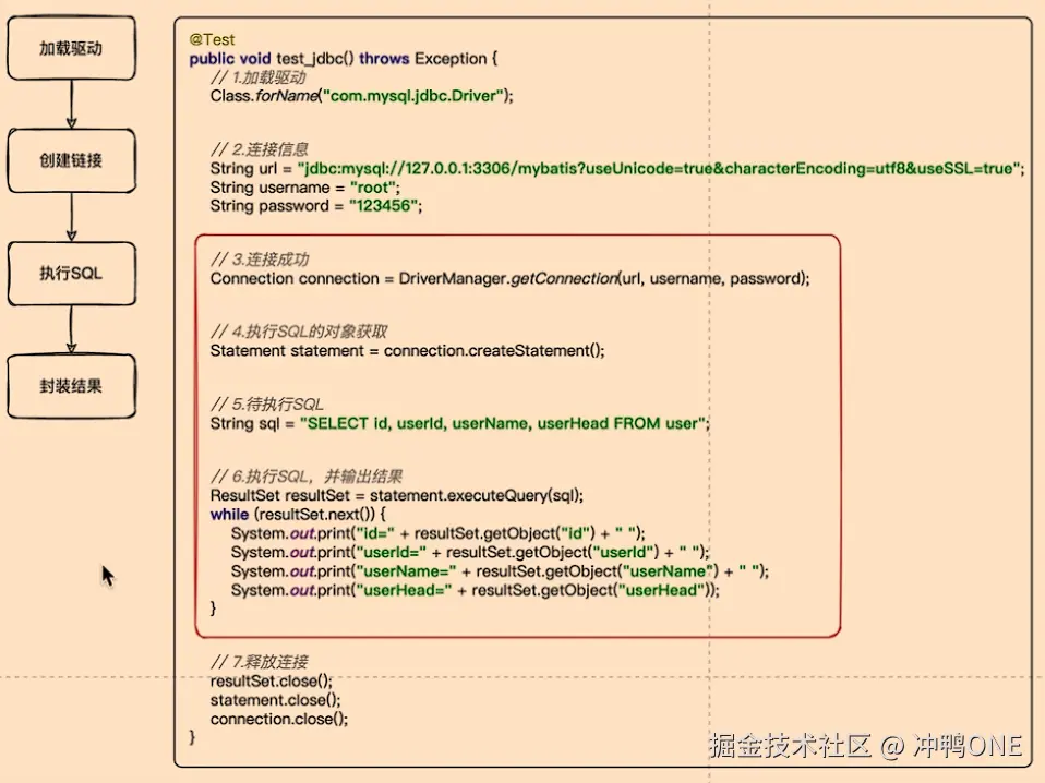 而参考我们最开始使用 JDBC 的方式,从连接、查询、封装、返回,其实都一个固定的流程,那么这个过程就可以被提炼以及封装和补全大家所需要的功能。