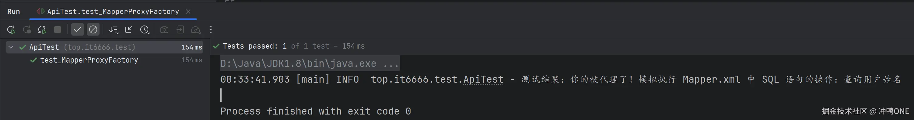 00:33:41.903 [main] INFO top.it6666.test.ApiTest - 测试结果:你的被代理了!模拟执行 Mapper.xml 中 SQL 语句的操作:查询用户姓名