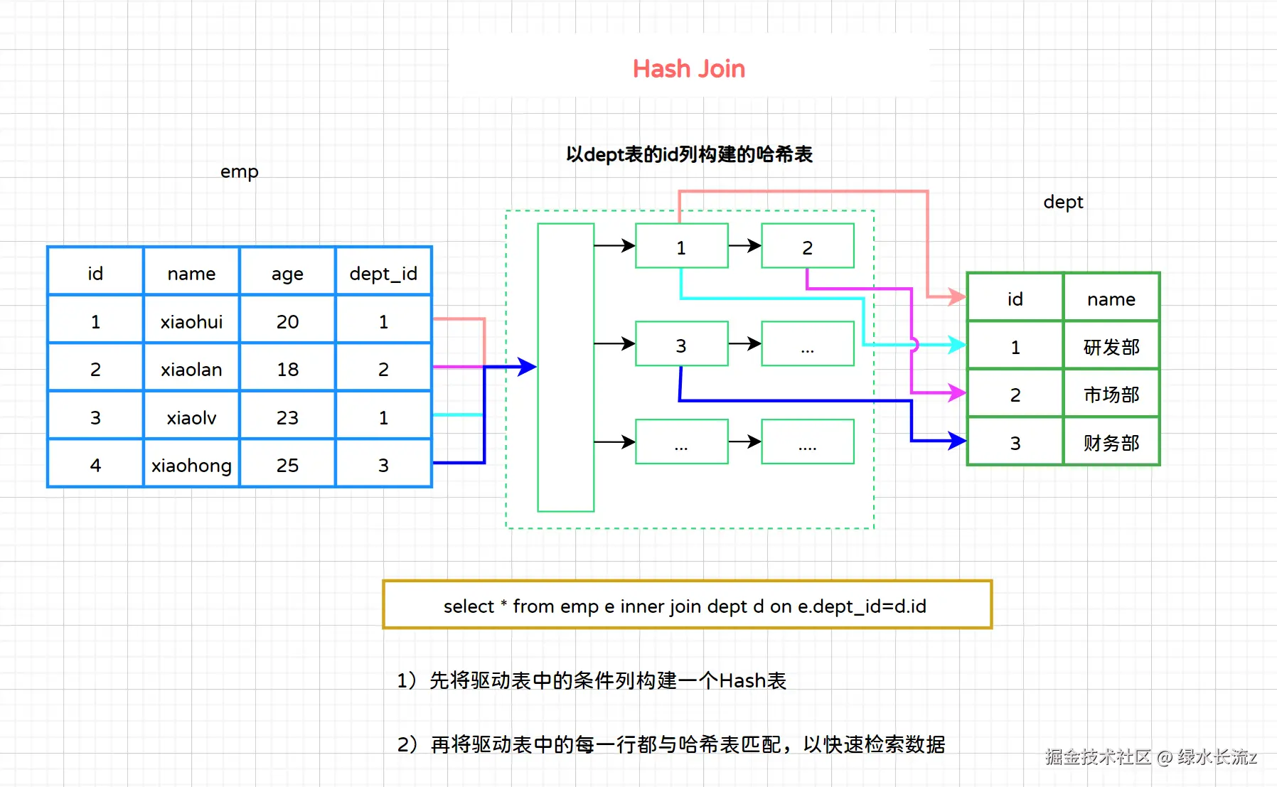 Hash Join 通过构建一个哈希表包含来自一个表的连接列的值,然后扫描另一个表,检查该表中的每一行是否存在于哈希表中。这种 JOIN 方式非常适合大规模数据集和等值连接条件。