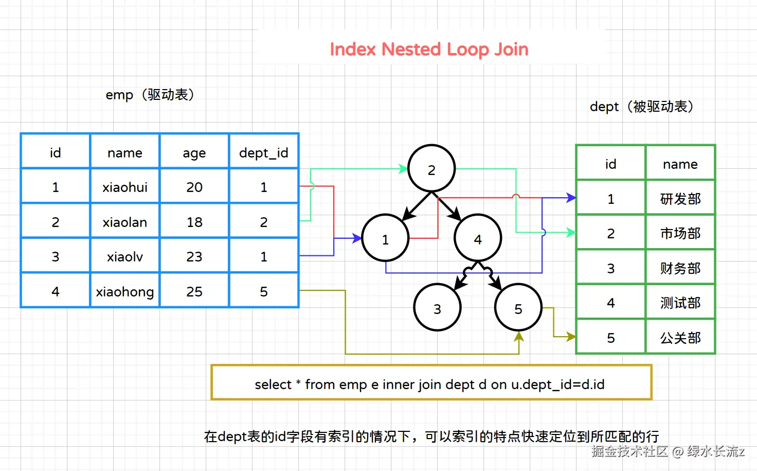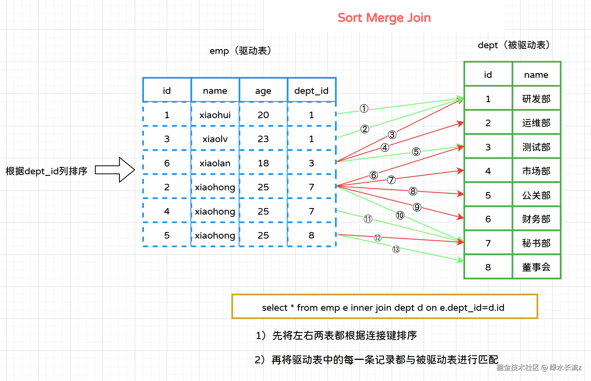 例如:如果 employees 和 departments 都是根据 department_id 和 id 排序的,那么 MySQL 可以简单地同时遍历两个表,只比较相等的键值,从而高效地完成 JOIN。