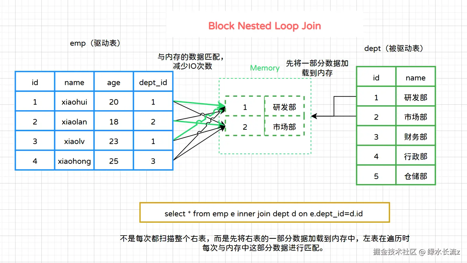 BNLJ 与 NLJ 类似,但 MySQL 会尝试将尽可能多的 departments 行加载到内存中,然后用 employees 表的每一行去匹配这些已经加载到内存中的 departments 行。
