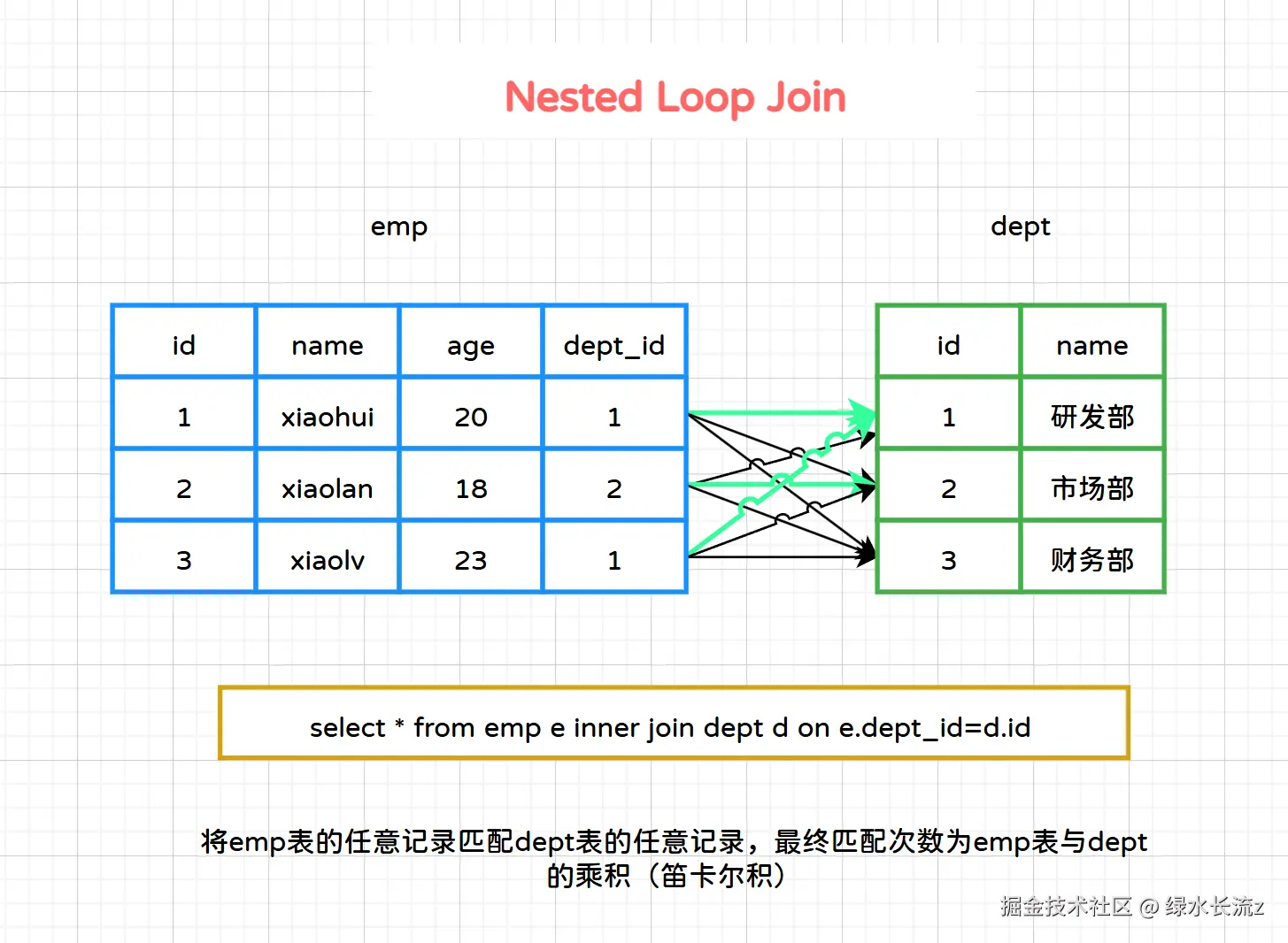 对于左表中的每一行,遍历右表的所有行寻找匹配的记录。这是一种最基本的连接方式,适用于小规模数据集或当没有合适的索引可用时。