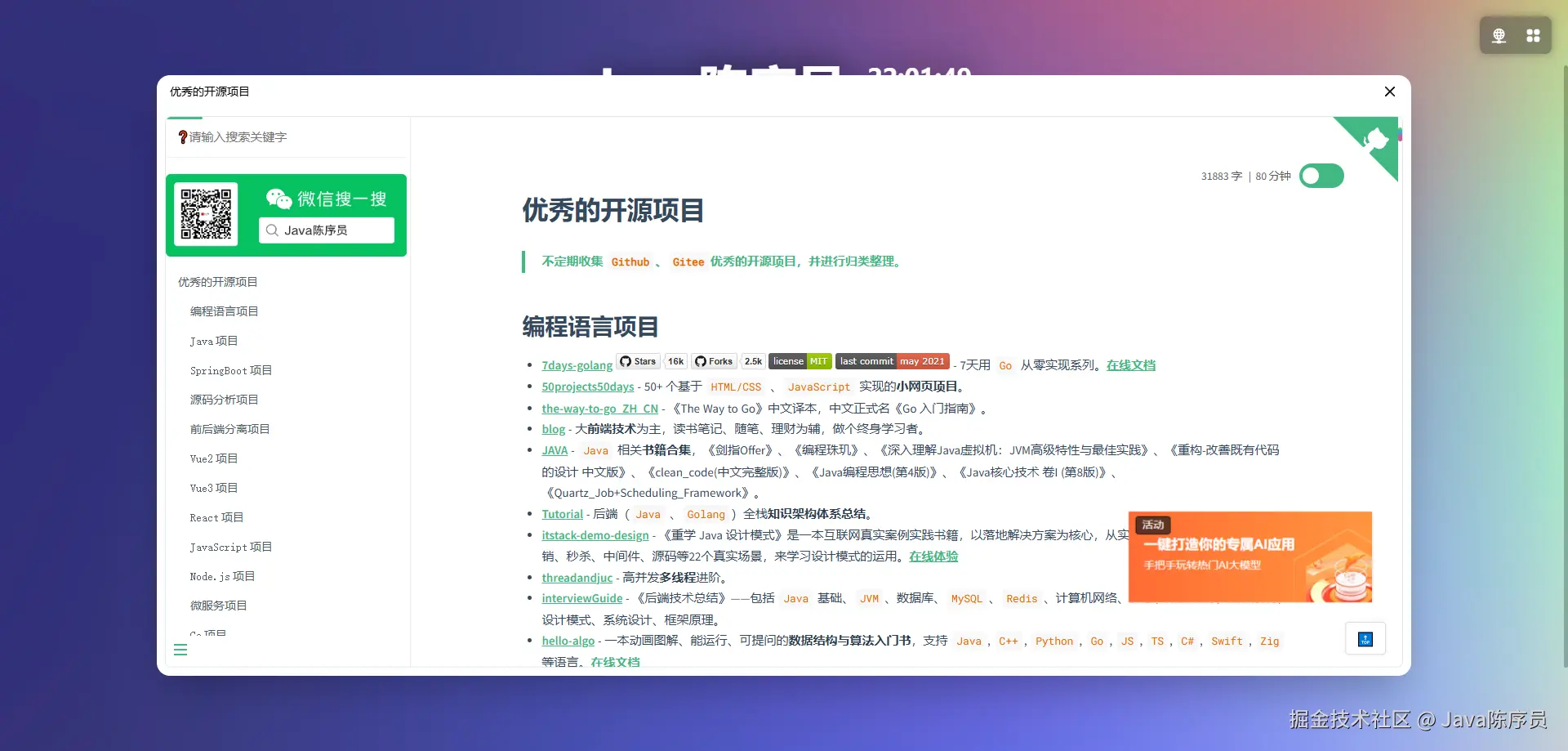 关注微信公众号:【Java陈序员】,获取开源项目分享、AI副业分享、超200本经典计算机电子书籍等。
