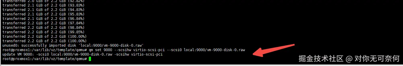 qm set 9000 --scsihw virtio-scsi-pci --scsi0 local:9000/vm-9000-disk-0.raw