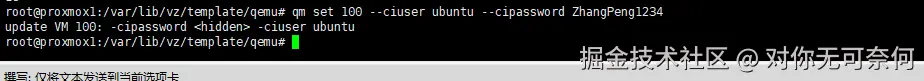 qm set 100 --ciuser ubuntu --cipassword ZhangPeng1234