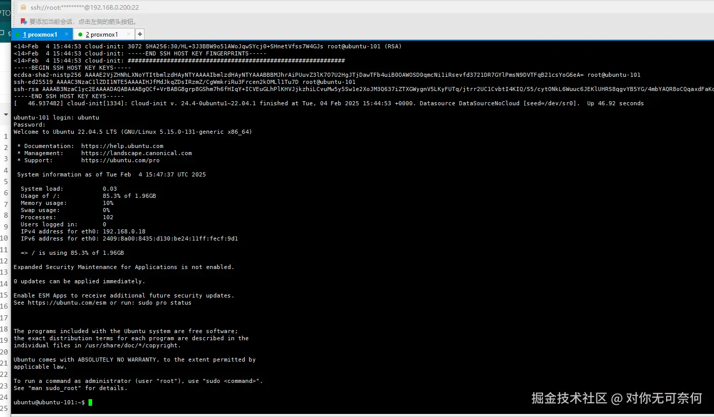 紧接着可以通过shell自行登录验证虚拟机实例!这里有个我很喜欢的,创建的VM 100实例的hostname 总算是我克隆模版自定义的name ubuntu-100.比较服务我个人的审美预期!