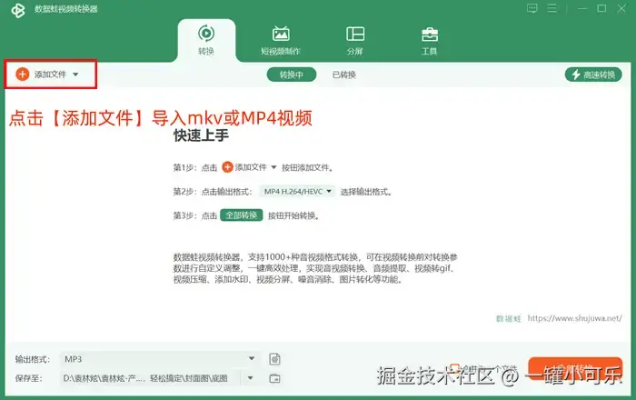 步骤1:打开数据 蛙视频转换器,进入格式转换界面,点击【添加文件】导入mkv或MP4视频。