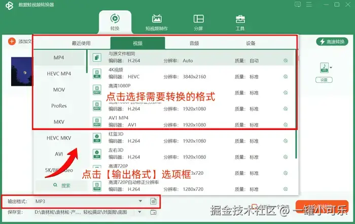 步骤2:点击【输出格式】选项框,选择视频格式界面,点击选择需要转换的格式。
