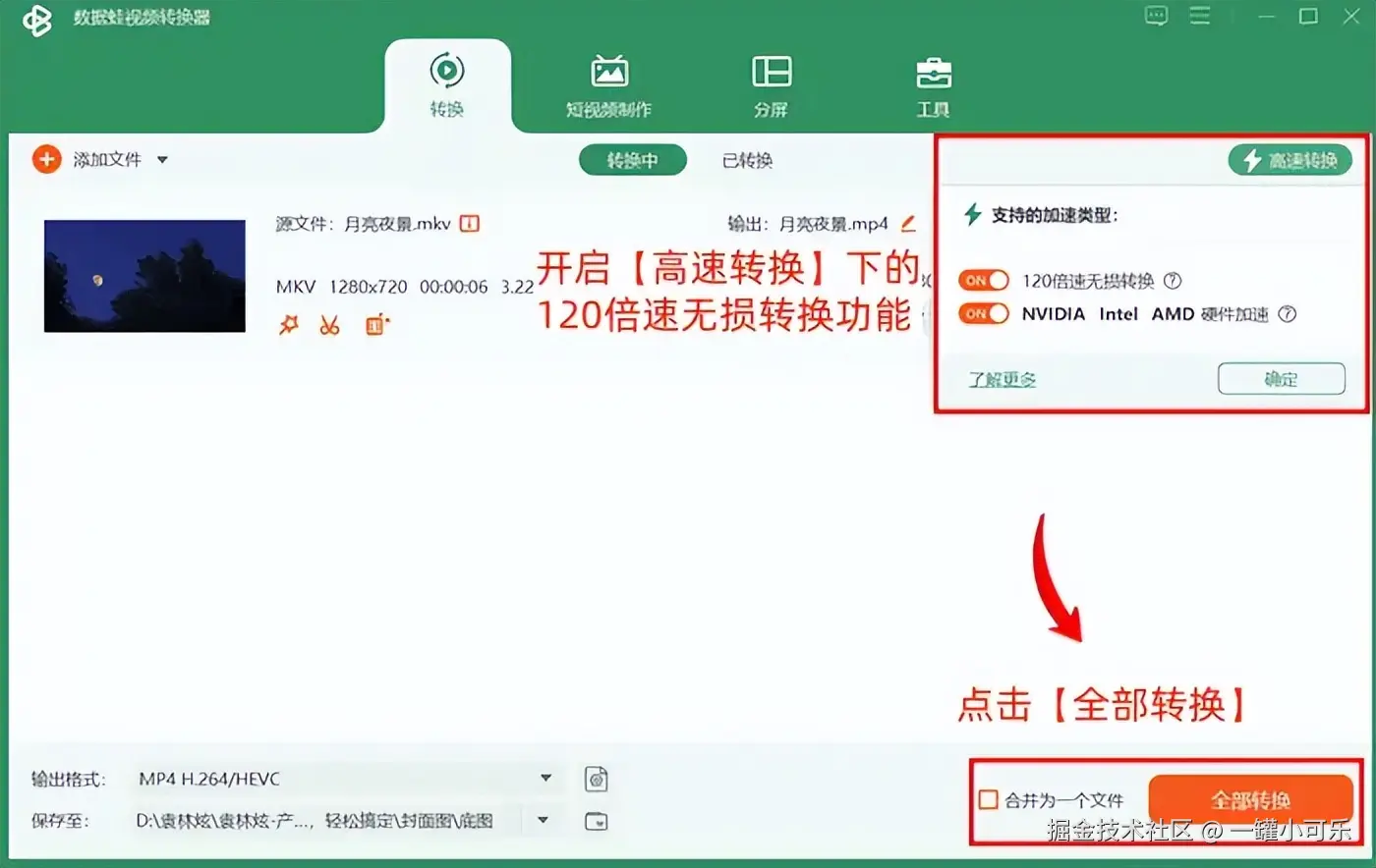 步骤3:开启【高速转换】下的120倍速无损转换功能,最后点击【全部转换】即可。