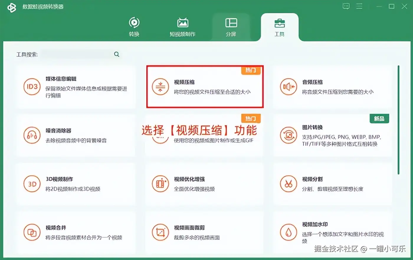 步骤1:进入数据 蛙视频转换器的【工具】界面,选择该界面下的【视频压缩】功能。