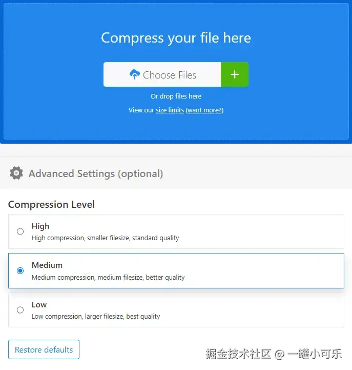 操作步骤: 点击zamzar网站的压缩选项,点击【choose files】,选择压缩水平即可。
