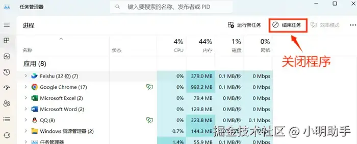 第二步:在任务管理器中找到内存占用较大的程序,关闭不需要的程序。
